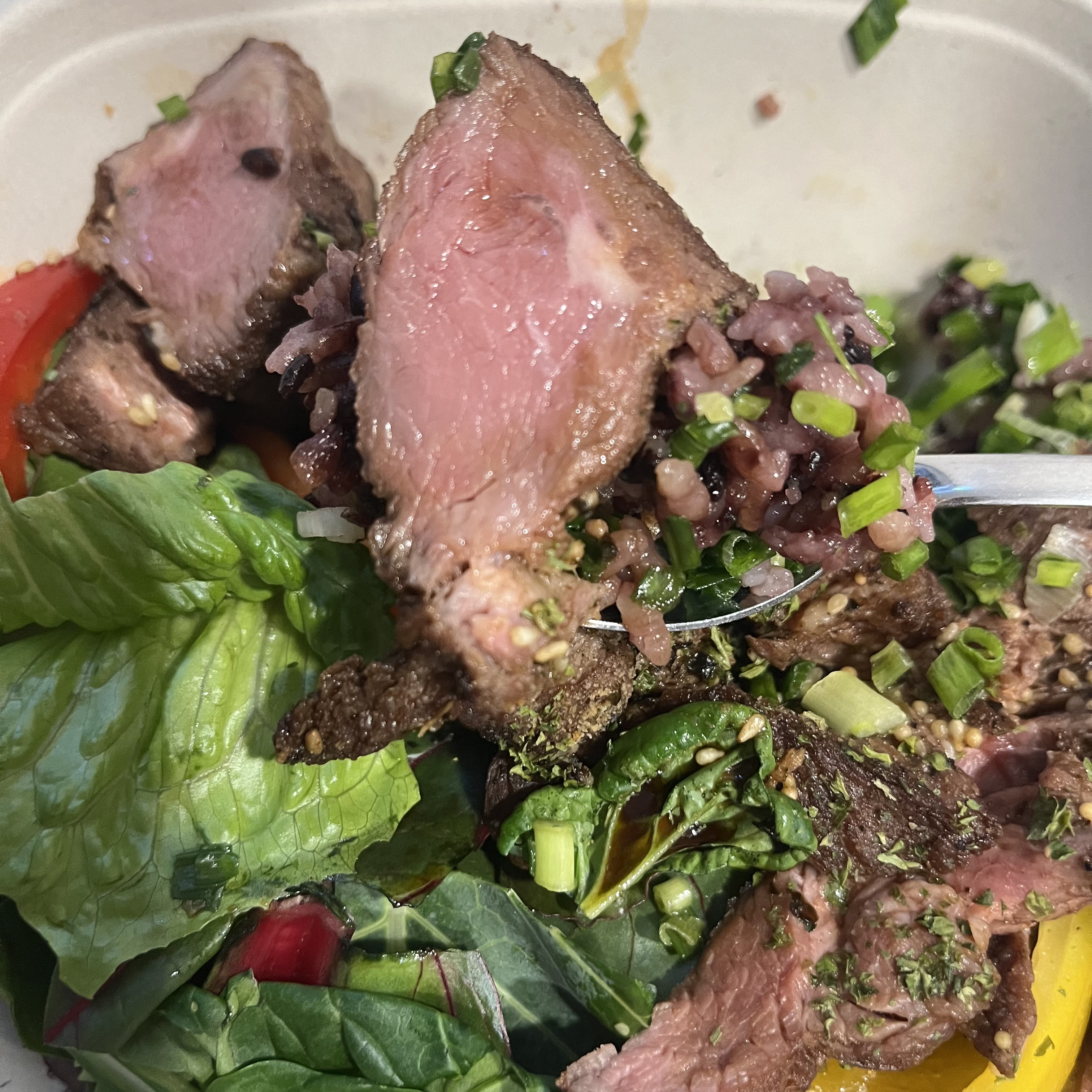흑미밥과 쪽파, 와사비 소스, 소고기,